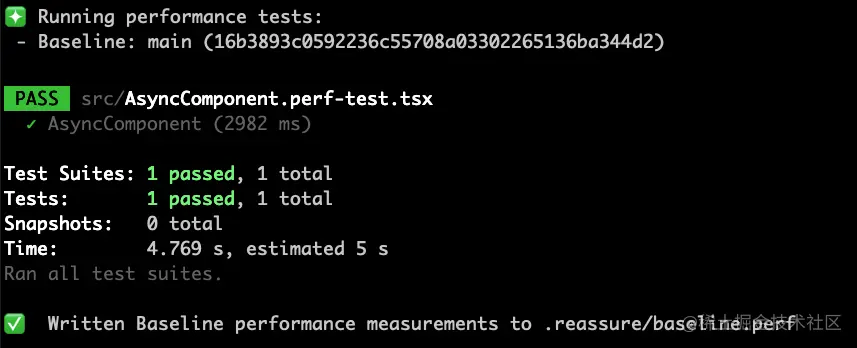 通过 CLI 运行时,Reassure 将生成性能比较报告。需要注意的是,要获得不同的测量结果,我们需要运行两次。第一次使用 --baseline 标志,在 .reassure/ 目录下收集测量结果。