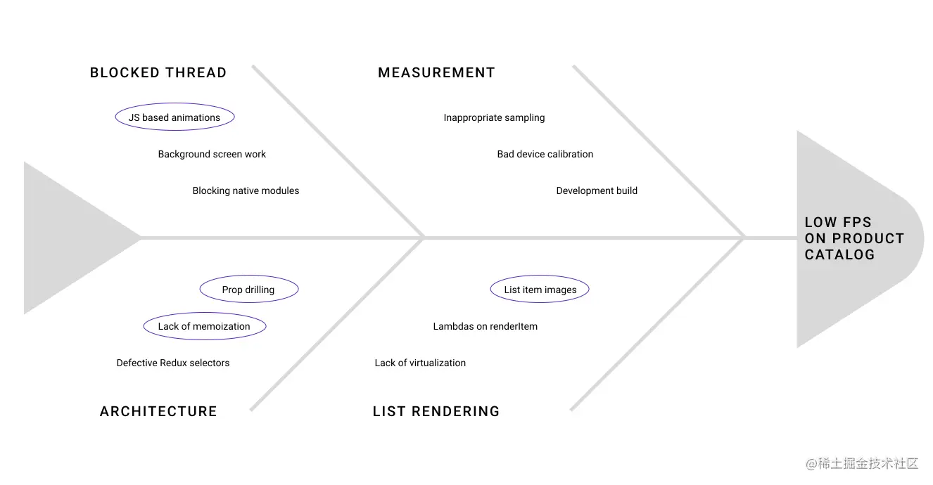 定义问题最常用的工具之一是因果图。它看起来像一条鱼,我们应该从右向左画。我们从包含问题陈述的头部开始(在定义阶段,我们应该已经有了问题陈述)。然后,我们找出问题的所有潜在主要原因,并将它们分配到鱼骨上。接下来,我们将所有可能的原因分配给每个主要原因。由于影响应用程序性能的原因有很多,因此缩小列表范围非常重要。尽量概括并关注最重要的因素。