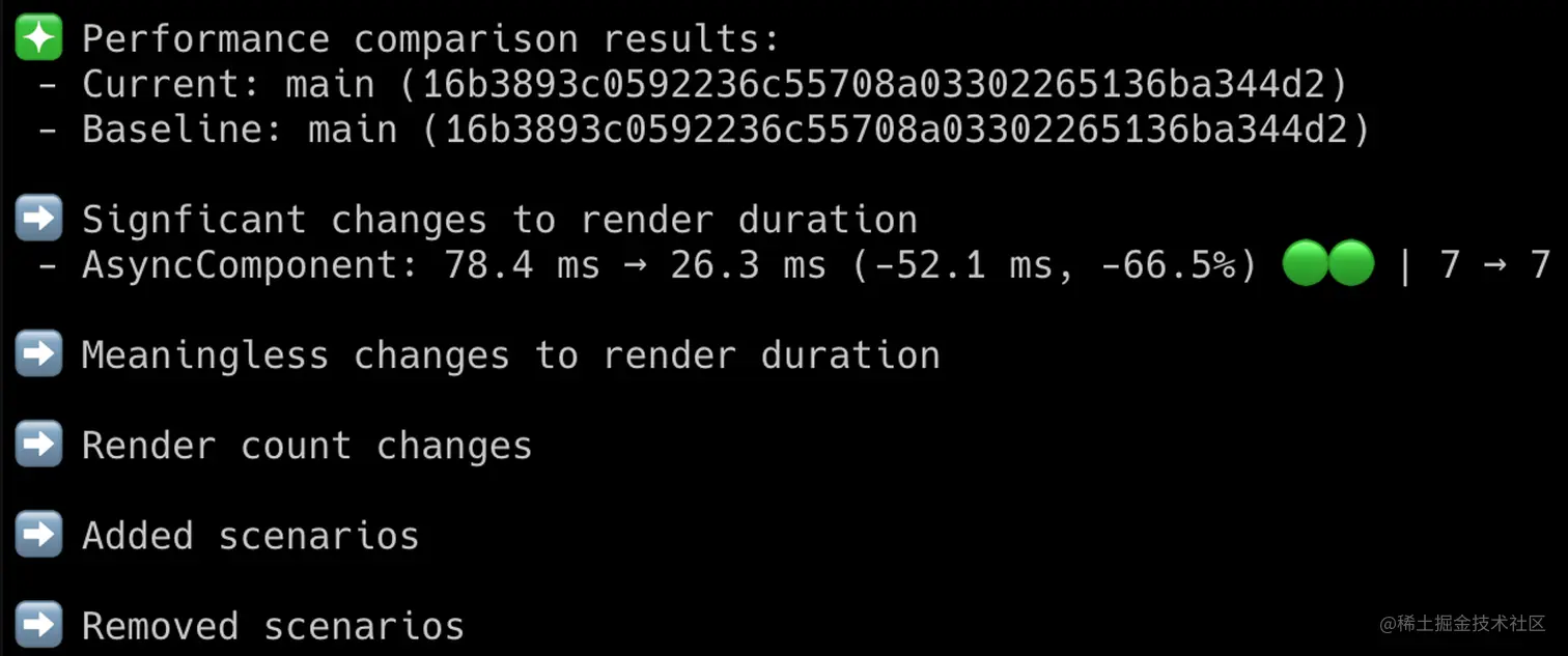 现在,Reassure 有两个测试运行可以比较--当前测试运行和基线测试运行--它可以准备一份性能比较报告。正如你所注意到的,由于对 AsyncComponent 渲染的 SlowList 组件应用了 memoization,渲染持续时间从 78.4 ms 降至 26.3 ms,性能提高了大约 66%。