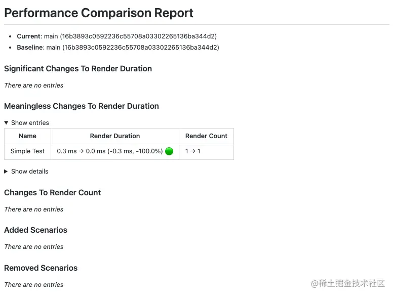 它的工作原理是测量您提供的测试场景的某些特性(渲染持续时间和渲染次数),并将其与之前测量的稳定版本进行比较。它会多次重复测试场景,以减少运行环境对渲染时间随机变化的影响。然后,它将进行统计分析,以确定代码更改是否具有统计意义。最后,它会生成一份人类可读的报告,对结果进行总结,并将其显示在 CI 上或作为拉取请求的注释。