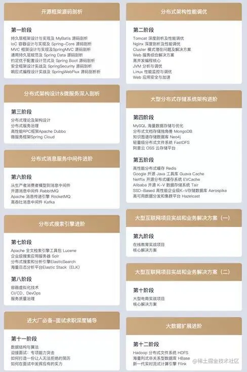 为了弥补自己这两个方面的短板,他历尽艰辛搞到了一份鹅厂的内部面试题,我研究了一下,发现从源码剖析、框架优化和定制、分布式架构设计、再到海量数据处理、高并发处理、最后到性能优化和调优。