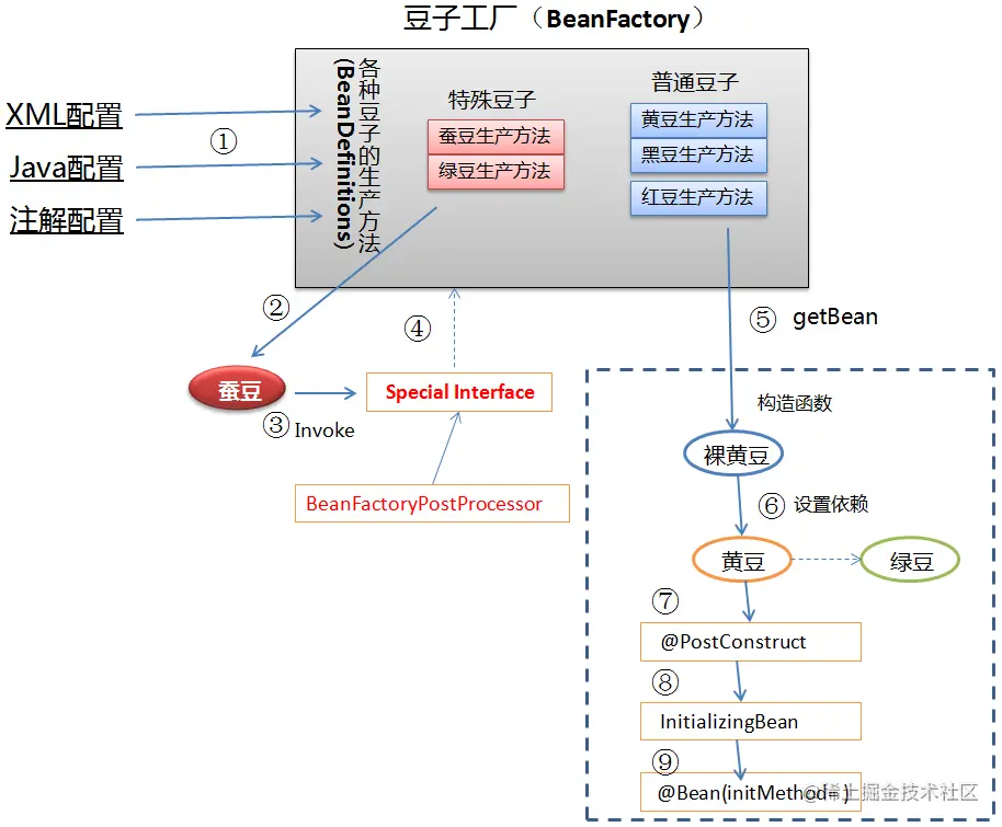 步骤3和4、 特殊豆子调用特定接口(例如BeanFactoryPostProcessor接口),可以对豆子工厂(BeanFactory)进行修改,或添加一些新豆子生产方法(即注册新的BeanDefinition到BeanFactory中)。