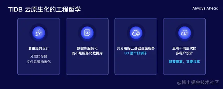八年前一开始设计 TiDB 的时候,我看到的东西就是一台台具体的服务器,我看到的是 CPU、内存、磁盘,基于这些东西我们构造了 TiDB。但是如果我们现在在云上构建 Serverless 这个系统,拿到的是一张白纸,我今天重新再开始去设计这个系统的时候,我看到的已经不是 CPU、磁盘机器这样的东西了,我看到的东西是云上给我的服务,EC2、虚拟机,我看到的是对象存储,我甚至可以看到云厂商的 RDS,我能不能拿 RDS 作为系统的一部分,所以在新的云原生的工程哲学里边必须有一条能够充分利用云的基础设施,这也是我们能把成本推到如此极限的一个核心的思想。