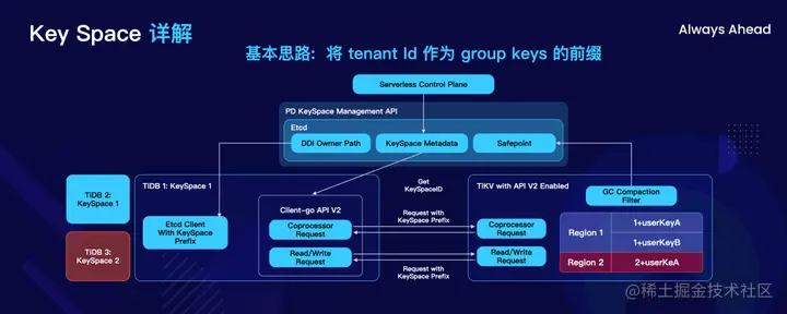 TiKV 是 TiDB 的存储引擎,所有的数据都是通过 key-value 来编码的,Key Space 本质上,就是在编码前面加上一个用户 ID 的前缀,将 tenant ID 作为 group keys 的前缀。