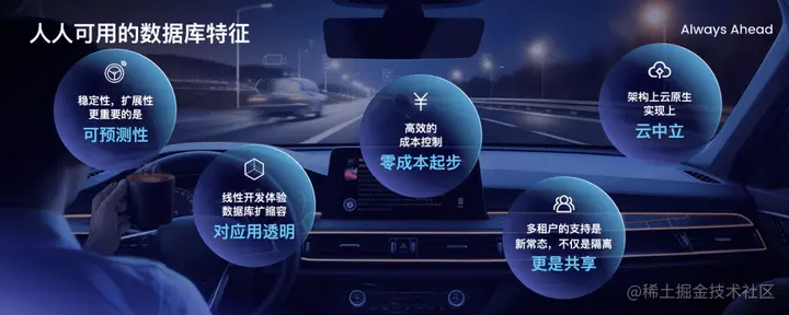 但是刚 才我说的那些新的需求或者面向未来的数据库 , 可能对每一项都会有更高的要求 。比 如你的系统已经具备了一定的扩展性和稳定性,但更重要的是你能不能给 用户一个 稳定的性能的预期 ,我经常说一句话,稳定的慢比不稳定的快其实更好 ,可预测性对系统和底层的架构提出了更高的要求;第二就是现在几乎每个分布式数据库都支持弹性扩容,而更高的要求可能是,在做这些扩缩容的复杂操作的时候,开发者、DBA 都不需要去费 心, 数据库的扩缩容对业务来讲是完全无感的 ,体验非常顺滑;成本层面, 我们再把成本压缩到极 限—— 我能不能,不用的时候就不花钱? 开源软件的分发上、下载不要钱,但是运行软件的服务 器要花钱,现在我们再往前想一步,——数据库、服务器 零成本的起步能不能支持 ;多 租户上,我们过去要去强调互相的隔离,但是如果为了实现大规模的海量的免费的用户、中小型的敏捷的业务 , 不仅要强调隔离,还得强调资源的高效利用和共享 ;云原生是老生常谈,做到 云中立 就是进一步的 目标。