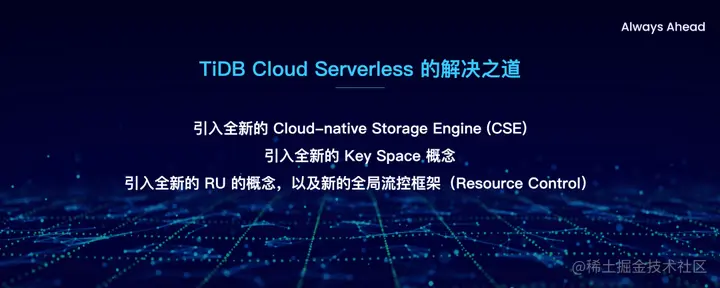 掀开 TiDB Serverless 的引擎盖,大概有三个新的东西,第一个换了新的云原生的引擎 CSE(Cloud-native Storage Engine),非常朴素的名字。第二是终于在 TiDB 引入了逻辑上的 Key Space,第三就是 Resource Control 以及 RU 的概念,从上到下做全局流控。