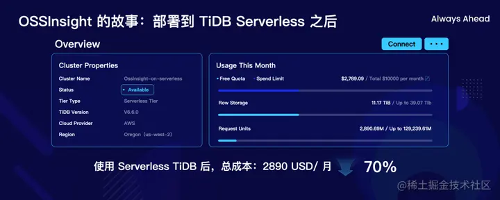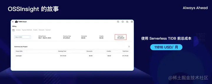 我最后分享一个小小的例子。我们公司内部也有自己用自己产品的习惯,这是我们自己的一些服务 demo,全部用 TiDB 自己构建。我们做了一个很有趣的工具叫 OSS Insight,把 GitHub 上的数据抓下来做分析的一个在线应用,这个在以前传统的 TiDB Cloud,也就是经典 TiDB 云上部署架构下,一个月的成本在一万美金左右,上图就是我们付给自己的账单。