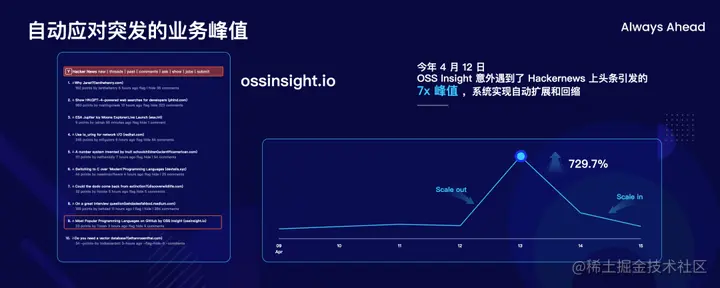这里有一个很有趣的真实例子,刚才我们看到整体的 TiDB Serverless 的设计是面向弹性去做设计的,但是这种东西总是希望能有一个实际的例子去验证一下这东西是不是真的在现实生活中比较好用,我们也真的有了这样的机会。今年 4 月初 OSS Insight 成功登上了 HackerNews 的首页,流量一下暴增到原来的 7 倍,这个事情还发生在中国时间的深夜,我们的工程师都还在睡梦中,TiDB Serverless 自动发现了流量的突变把集群扩容,承担起 7 倍流量的业务负载以后,又自动缩回来,前端业务的各项指标都还是非常稳定的,也没有额外的收费。这是一个特别好的例子,我们也特别欣慰。
