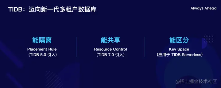 之前有人问我 TiDB 支持多租户、多应用这种模式吗,我当时一直都是比较保守,通过几个大版本的迭代,我现在可以负责任的说,TiDB 要去实现现代的多租户,基础的能力都已经满足了。
