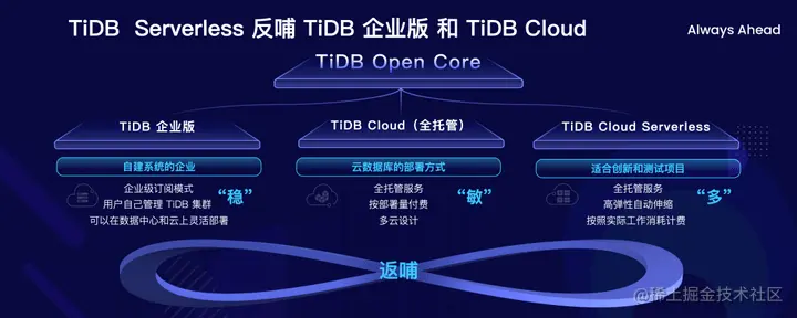 我今天分享了一些我们未来对数据库的看法,关于 TiDB Serverless,我还有三个点想强调。第一,虽然看到现在它是一个在纯 云端的服务,但是 我们有计划将更先进的架构服务于中国的客户 ,甚至你可以 未来在私有化环境里面部署 TiDB 的 Serverless。因为我们设计这个系统内核的时候非常仔细的考虑了这个系统本身的可移植 性, 刚才这些东西未来大家会在自己的数据中心或者自己的云上去使用 ;第二,我 个人认为这也是代表着数据库最前沿的发展的方向, 就是 云原生加上极致的弹性 ,我们在 思考数据库本身的一些架 构或者最底层的想法的变革都会遵循这个方向;第三点我个人觉得 Serverless 是我们很好的练兵场,包括中国企业级客户我们预研出来的版本我们新的一些特性,最早会在 Serverless 上应用 ,比如 刚才我说的 Key Space 这个功能,目前已经在 Serverless Tier 上实现了上万个用户的部署,经过上万个集群的打磨,很快也会在企业版和云上托管版本里边落地。