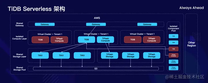 图中 TiDB 右边现在已经把所有的包括计算节点存储节点全都变成了池化的设计,最上面加入了一层 Gateway,用户直接连接到 Gateway,Gateway 负责对现在用户的请求从资源池中捞出一个活跃的节点,它不用的时候连接断开再放回去。