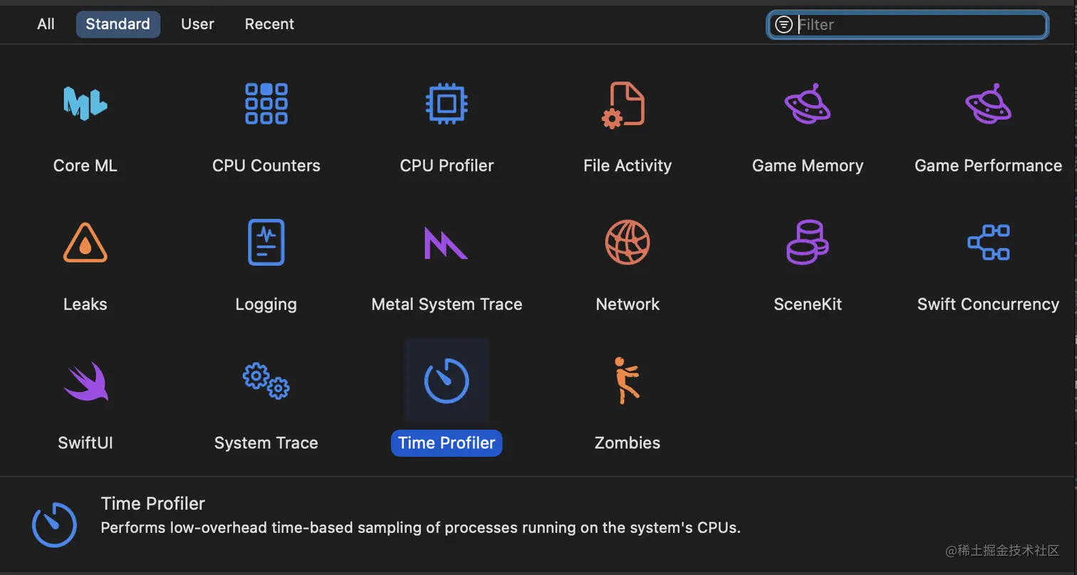 Instruments 是一款调试和剖析工具,预装在 Xcode 中,是一个工具箱,每个工具都有不同的用途。您可以从一个模板列表中进行选择,并根据您的目标(如提高性能、电池续航时间或修复内存问题)选择其中任何一个模板。