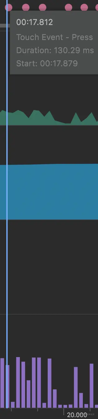 要查看更详细的视图,我们必须双击选项卡。现在我们可以看到更多细节。当用户开始执行一些触摸操作(上例中的轻扫)时,我们可以看到更多的 CPU 工作。每个应用程序都有自己的 CPU 峰值和低值特征。重要的是要通过与之交互,并将某些活动(如触摸事件)与增加的使用量配对起来,从而建立起对它的直觉。换句话说,有些峰值是预料之中的,因为需要完成工作。当 CPU 使用率长时间或在意想不到的地方非常高时,问题就来了。