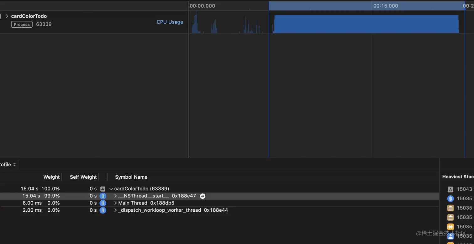 点击开始,剖析器就开始运行了。在使用 Time Profiler 进行剖析时,我们执行的流程和操作与之前相同。停止时,我们将看到收集到的所有数据。