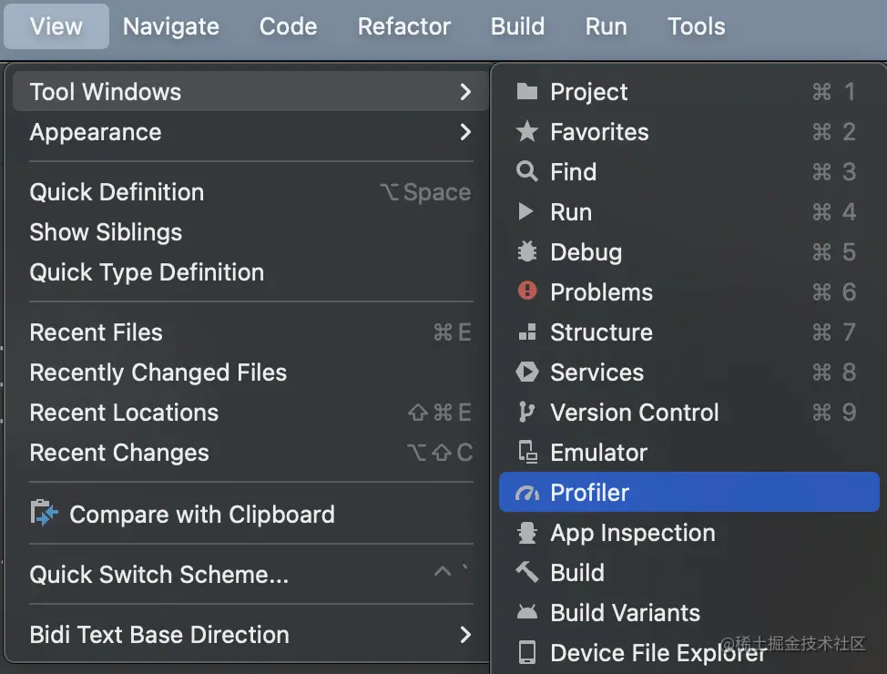 要打开剖析器,请从 Android Studio 菜单栏选择 "视图">"工具窗口">"剖析器":