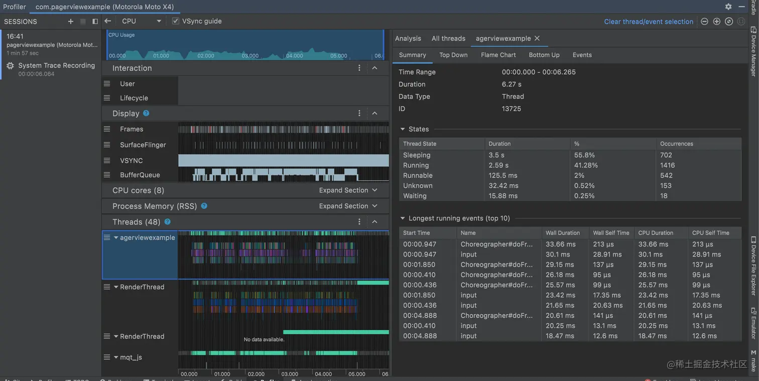 您还可以查看 React Native 核心团队的官方Android Profiling guide。它们使用的工具不同,但结果是一样的。该指南提供了案例研究以及如何在不同线程上发现问题: