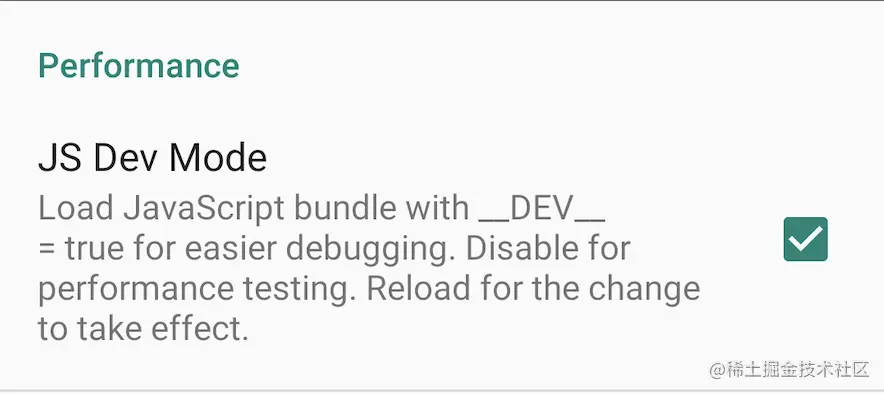 - 关闭开发模式。您必须确保应用程序使用的是 JS 捆绑程序,而不是提供该捆绑程序的 metro 服务器。要关闭开发模式,请共享您的设备,点击 "设置 "并找到 "JS 开发模式":