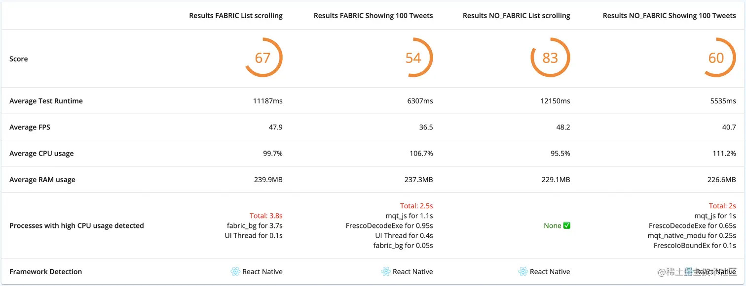 每个绿地 React Native 应用程序只有一个 Android 活动。如果您的应用有多个活动,那么它很可能是一个 "棕地 "活动。点击此处了解有关棕地方法的更多信息。在上面的示例中,我们看不到任何有趣的东西。一切运行正常,没有任何故障。让我们检查一下各项指标: