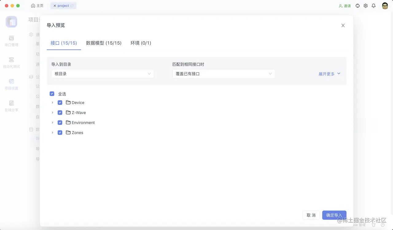 把 JSON 文件拖进去后,Apifox 会进行解析,并弹出窗口,让你选择你所需要导入的接口!!!这点就做的比 YApi 好,因为 YApi 没有这个功能,它只能导入所有~