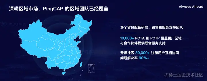 PingCAP 一直聚焦如何能够服务好中国市场的企业级客户。我们在北、上、广、深、江浙和四川专门成立了从研发到销售到售后的全链条服务体系。在全中国,有超过一万名的 PCTA 和 PCTP 数据库专家覆盖更广的区域,与区域合作伙伴提供联合的服务支持。我们引以为豪的 TiDB 开源社区已经有超过三万多名注册用户,AskTUG 上问题的互助解决率已经超过了 90%。这是 TiDB 开源软件强大的基因和能力,倪院士也提到开源是中国软件发展的重要方向。