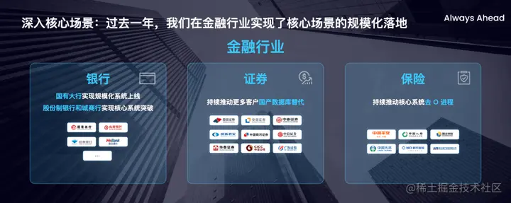 过去十年时间中国企业级市场的发展,特别是国产化替代领域,金融行业一直是排头兵,走在了行业的最前列。 过去这一年,TiDB 在国有大行实现规模化的系统上线,在股份制和城商行进入了核心系统。 过去的一年和今年证券行业进入了国产化替代的高峰阶段,我们看到越来越多的业务系统正在使用 TiDB 数据库承载。 TiDB 也进入了保险企业的核心系统,多家保险企业把传统数据库迁移到了 TiDB。