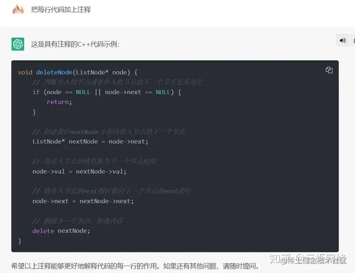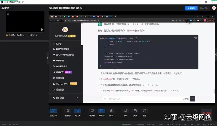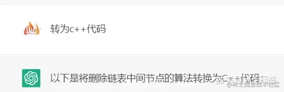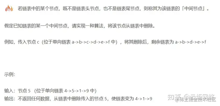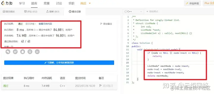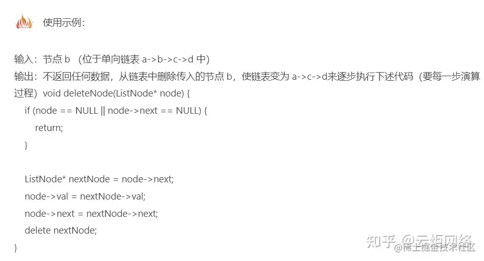 【直播回放】ChatGPT刷力扣面试题 02.03. 删除中间节点 ChatGPT云炬学长 2023-07-26 84 阅读1分钟 直播截图 题目描述 若链表中的某个节点,既不是链表头节点,也不是链表尾节点,则称其为该链表的「中间节点」。 假定已知链表的某一个中间节点,请实现一种算法,将该节点从链表中删除。 例如,传入节点 c(位于单向链表 a->b->c->d->e->f 中),将其删除后,剩余链表为 a->b->d->e->f 示例: 输入:节点 5 (位于单向链表 4->5->1->9 中) 输出:不返回任何数据,从链表中删除传入的节点 5,使链表变为 4->1->9 开始解题(C++) 逐步验算