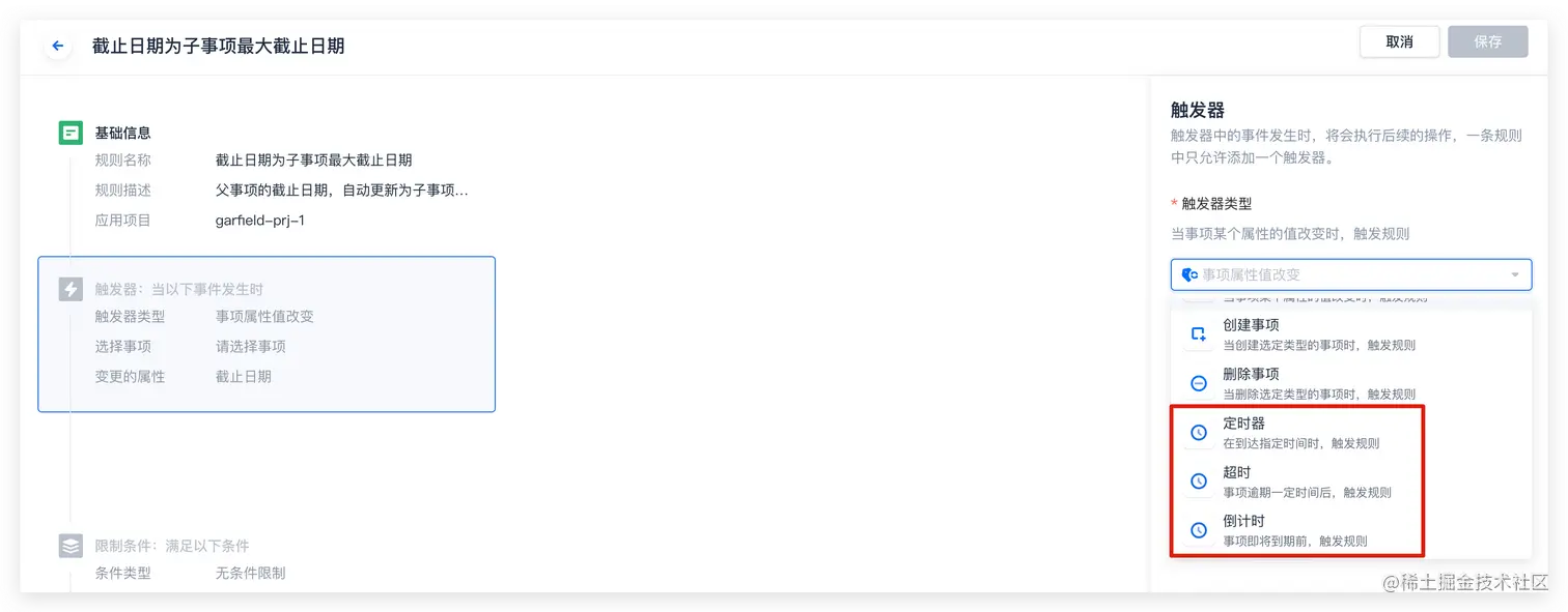 - 超时触发器:实现在事项逾期 x 天/小时/分钟后执行指定动作;