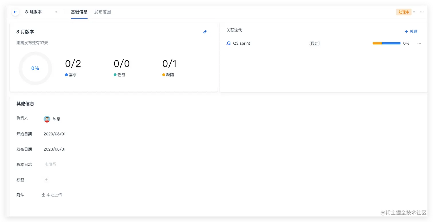 点击任一版本名称进入其详情页,您可以看到新增的「基础信息」概览页面。在该页面中,您可以快速查看版本完成进度、版本内的需求/任务/缺陷数,或修改开始/截止日期、版本状态等信息。