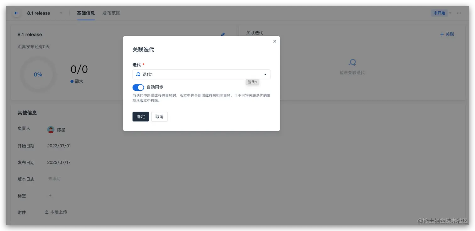 此外,版本支持关联任一指定迭代,并可设置自动同步迭代事项。开启自动同步之后,当关联迭代中新增或移除事项时,版本中也会新增或移除相同事项,且不可将关联迭代的事项从版本中移除。