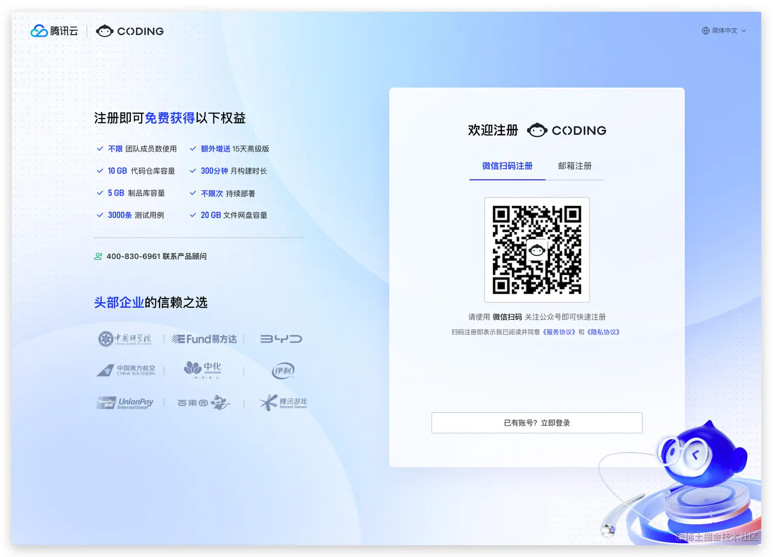 除原有邮箱注册方式以外,CODING 新增微信扫码注册方式。用户扫码关注 CODING 服务号并开启微信通知后,可在微信内接收关键事项通知(如事项待办、版本到期提醒等)。
