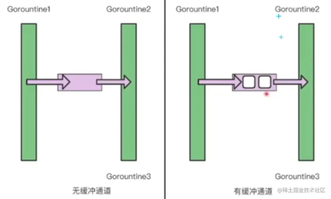 通过make(chan 元素类型,[缓冲大小])来创建一个通道,若不添加第二个参数则创建无缓冲通道,否则创建一个有缓冲通道,带有指定大小的缓冲区