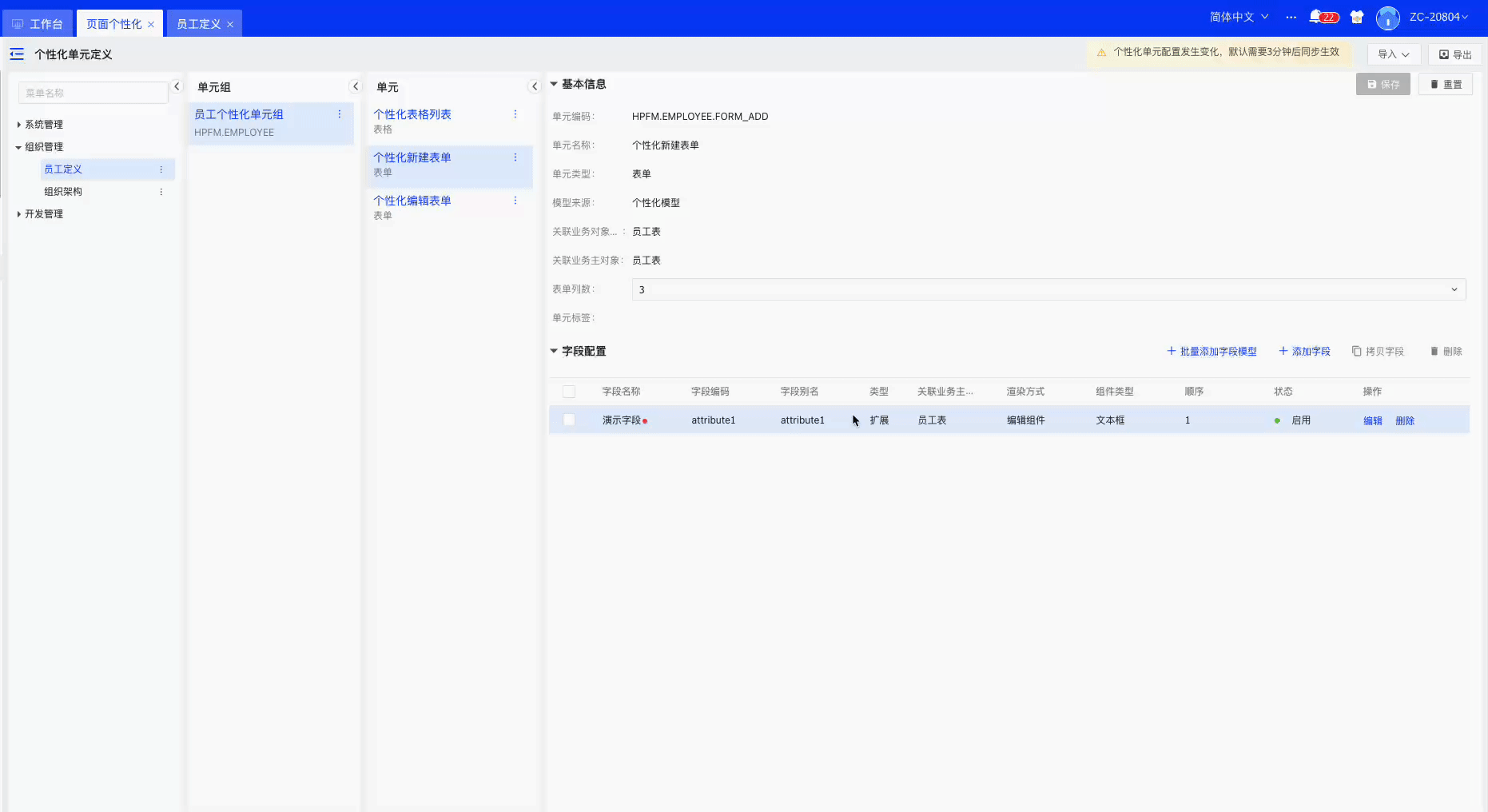 HZERO平台提供了灵活的页面个性化能力,可以为项目和用户定制功能页面,快速实现增减字段、调整前端组件样式和属性等需求。通过配置,用户可以更改字段名称、渲染方式、显示/隐藏、是否可编辑、是否必输、字段位置、默认值等,而无需修改代码。这种即配即用的方式极大地降低了开发成本和排期等待时间,从而为客户提供更优质的用户体验。