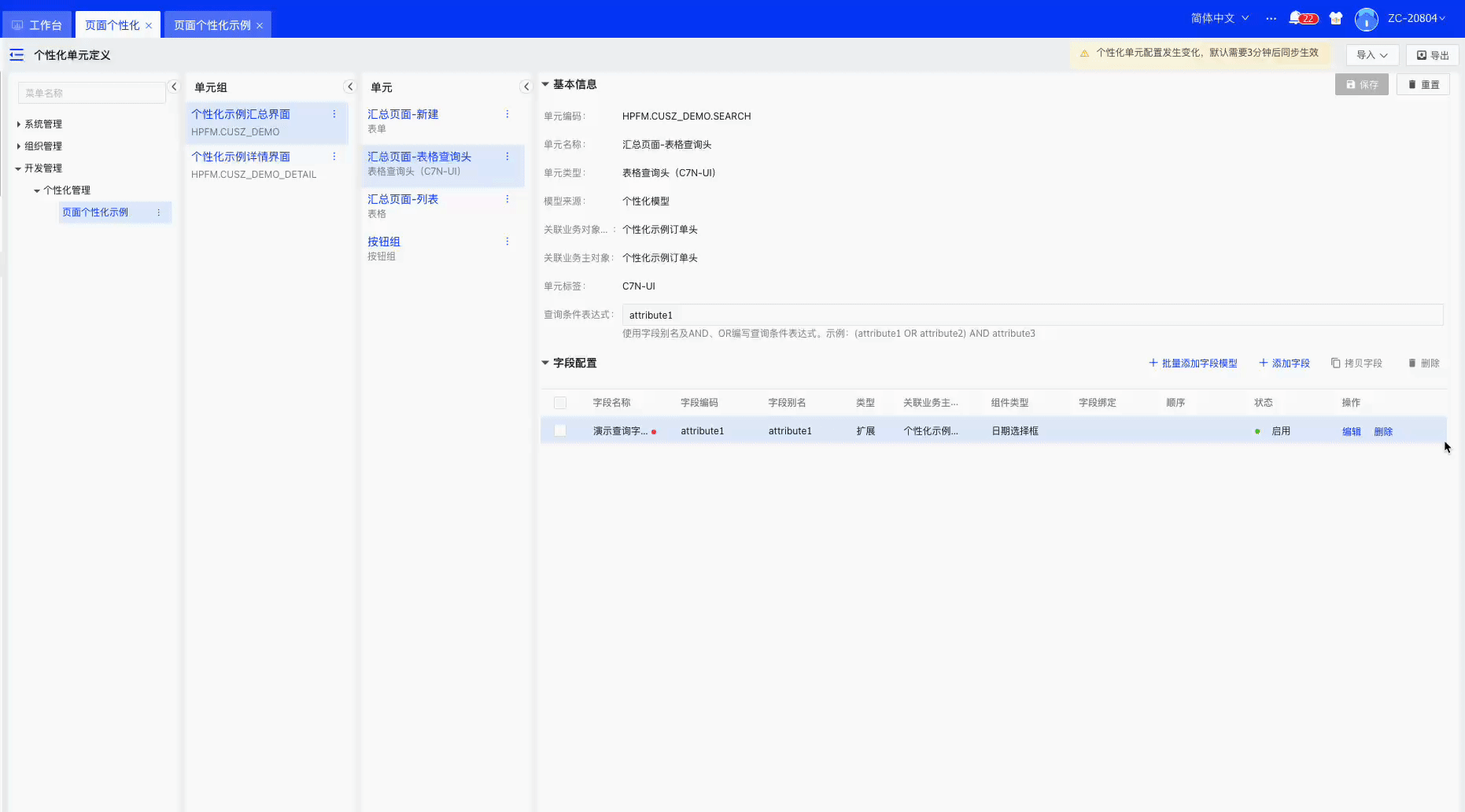 选择目标单元: 由于是要增加查询条件,首先需要进入到页面个性化单元页面,左侧依次打开开发管理-个性化管理-页面个性化示例菜单,选中个性化示例汇总页面下的汇总页面-表格查询头单元。