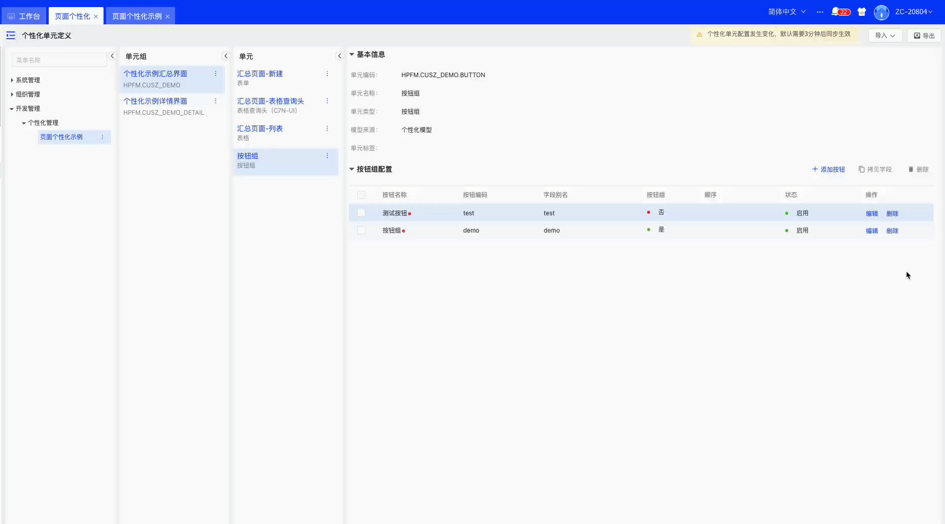 选择目标单元: 由于需要增加按钮组,所以在选中【页面个性化示例】页面后,需要将“单元组”选项设置为【个性化示例汇总页面】,并在“单元”列中选择【按钮组】以进行相应设置。