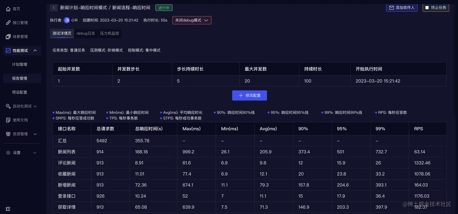 在计划管理中,需要给该计划下的每一个场景设置任务配置。 RunnerGo支持并发模式、错误率模式、阶梯模式、响应时间模式、每秒应答数模式等多种压测模式,模拟真实场景。