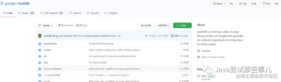 目前,leveldb已经在Github上标星 24.2K,累计标星 5.3K(Github地址:github.com/google/leve…