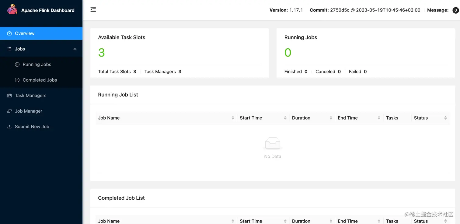 启动成功后,同样可以访问http://node01:8081对flink集群和任务进行监控管理。 这里可以明显看到,当前集群的TaskManager数量为3;由于默认每个TaskManager的Slot数量为1,所以总Slot数和可用Slot数都为3。