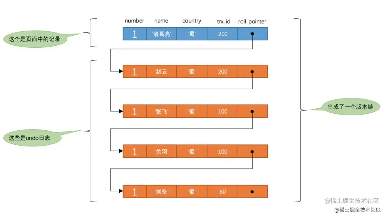 trx_id:每次一个事务对某条记录进行改动时,都会把该事物的id赋值给trx_id列;roll_pointer:每次对某条记录进行改动时,都会把旧版本的记录写入到undo日志中,然后roll_pointer列就相当于一个指针,指向undo页中原来的记录,如果有多次修改,那么就会形成一个版本链。