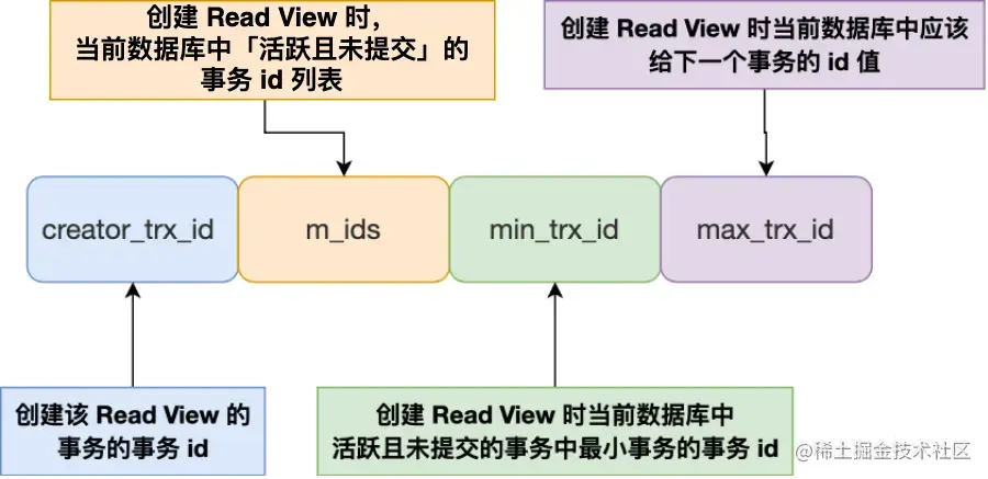 为此,引入了一个ReadView的概念,其组成如上图所示: