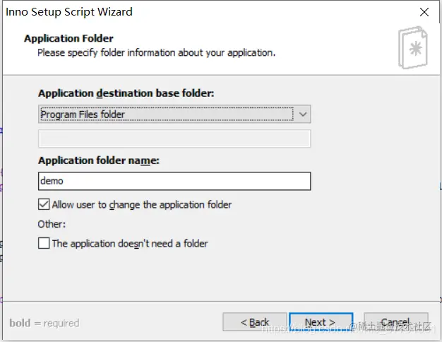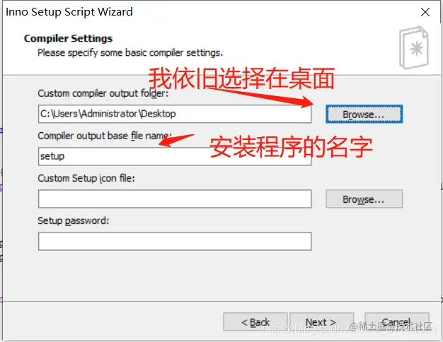 - 中间的选项直接下一步,直到这个页面填入输出位置和程序名称