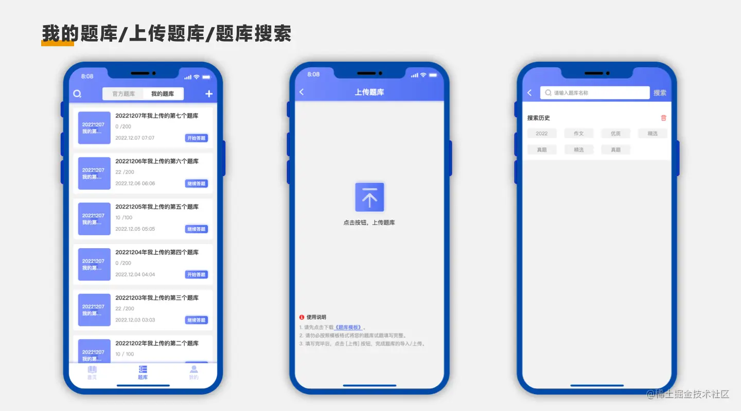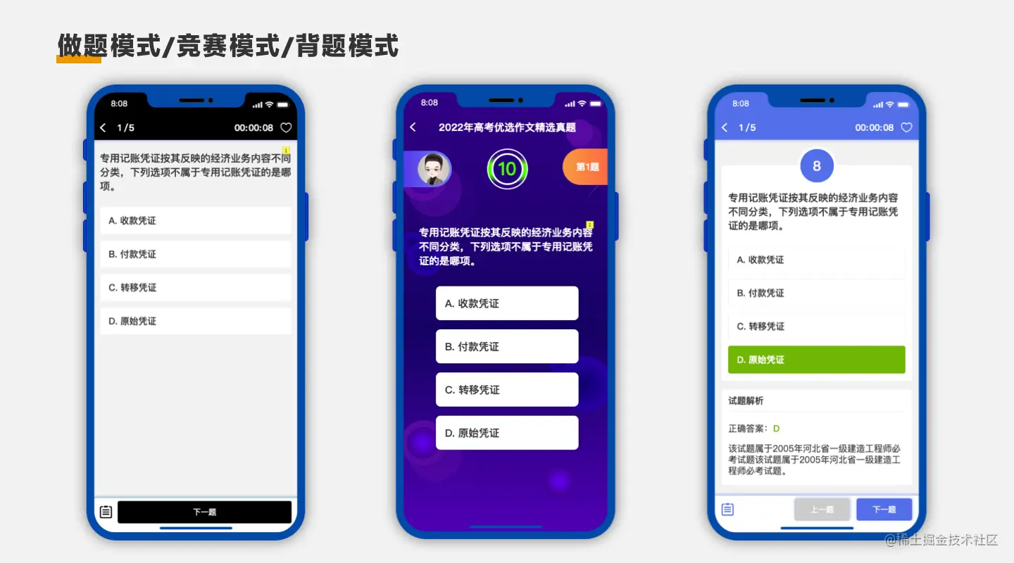 本产品原型提供多种智慧答题模式(做题模式、竞赛模式、背题模式)供用户按需使用,答题结果报告智能生成;海量的官方题库资源,同时允许用户上传自己的题库作为学习资源;三步轻松制定一个题库的学习计划,让学习具有目标性;采用Vip会员方式畅享使用该产品。