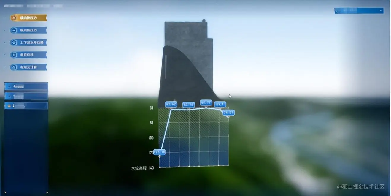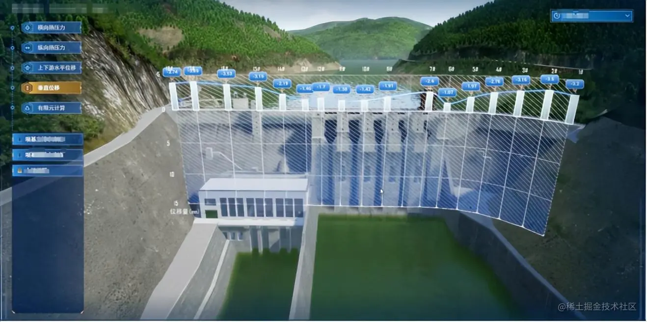 以数字孪生三维数据底板为基础进行数据可视化图表的融合叠加,能够更为直观的进行监测成果的可视化表达。如下图展示的,横向扬压力场景、上下游水平位移场景、垂直位移场景等。通过三维可视化图表数据和三维数字孪生场景的融合,综合模拟水利工程安全的物理形态,满足多尺度、多维度的数字孪生工程仿真模拟的需求。