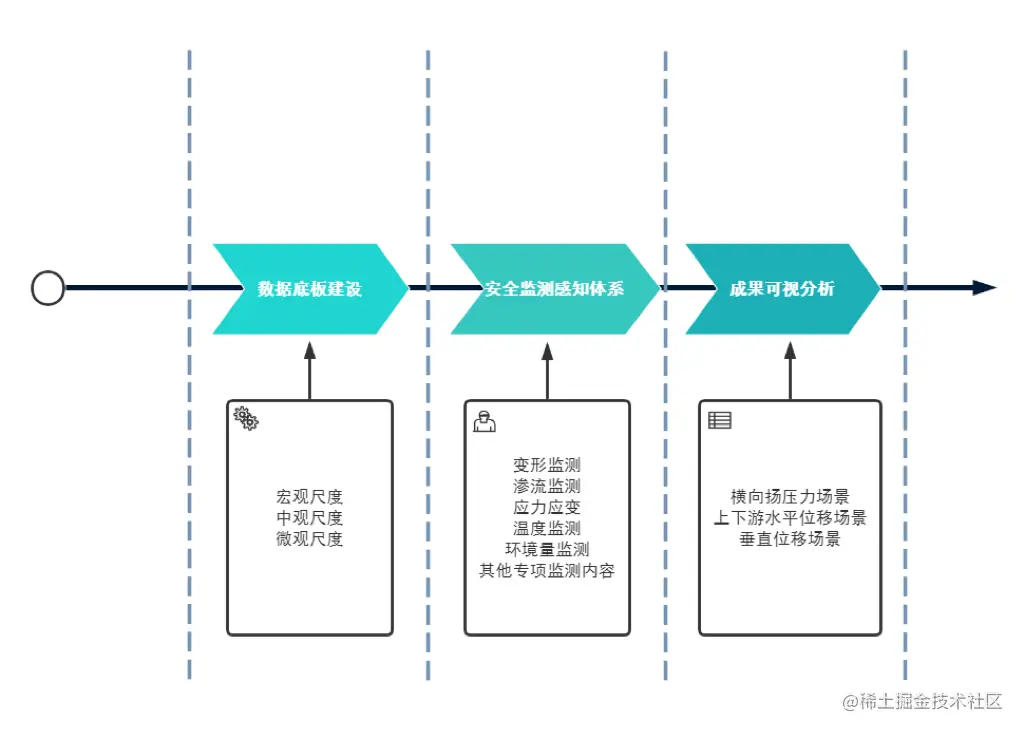 的稳定性和安全性,研究有无裂缝、滑坡、滑动和倾斜等趋势,数字化程度偏低,无法有效满足工程安全状态监控预警要求。通过水利工程安全监测感知体系获取的工程安全监测数据统一汇聚至数字孪生平台中的数据底板中,如水准监测、垂线监测、引张线监测等,为模型计算、可视化展示提供数据基础。