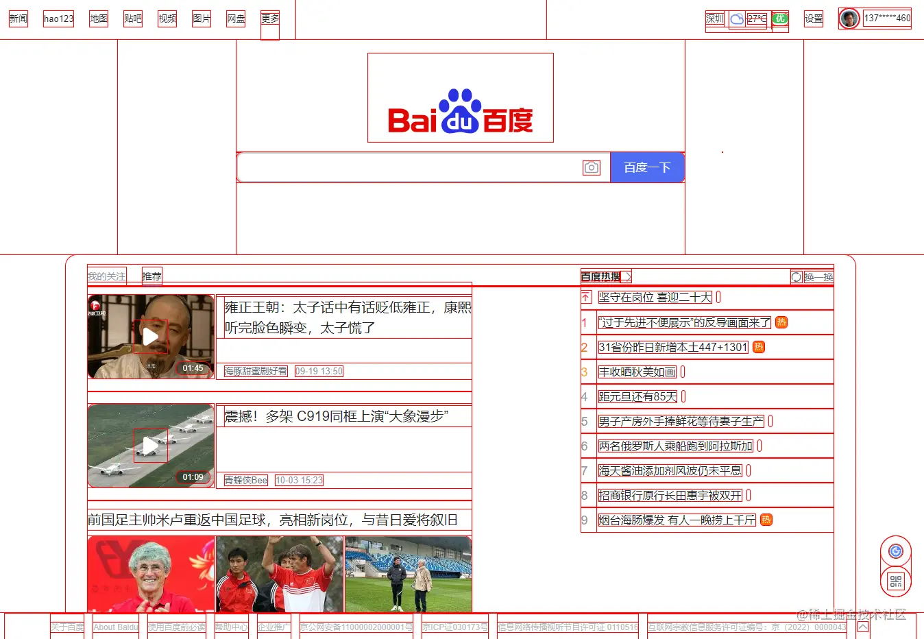 一个页面是由很多html元素组成的,而这些元素都是一个接一个盒子堆叠起来的。下面以百度首页为例