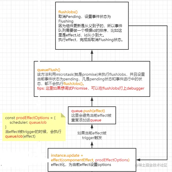 // 当effect被trigger的时候,会执行queueJob(effect) 所以不会立刻执行