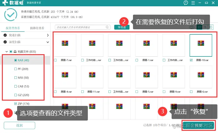 第3步:等待软件快速扫描结束,点击 【按类型查看】 ,选择丢失文件相应的文件类型 ,即可在右侧查看相关文件,确定文件需要恢复后,在图标右下角小方框上打上勾即可;