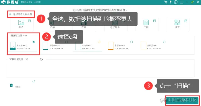第2步:勾选c盘,并且对需要进行扫描的文件类型进行选择(全选,数据被扫描到的概率会更大),点击 【扫描】 ;