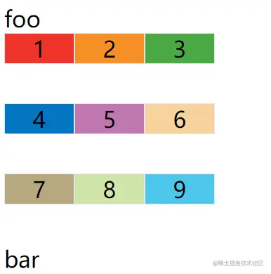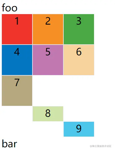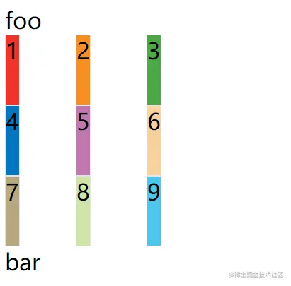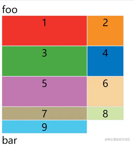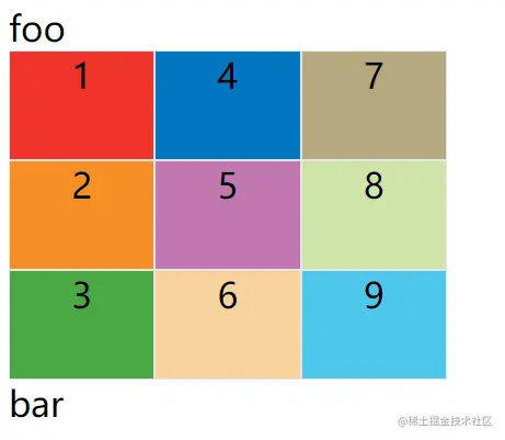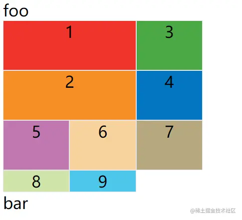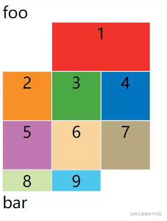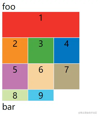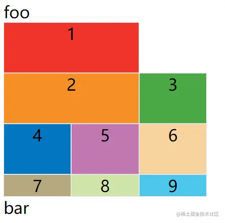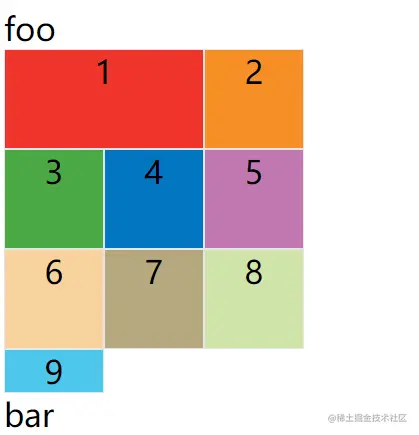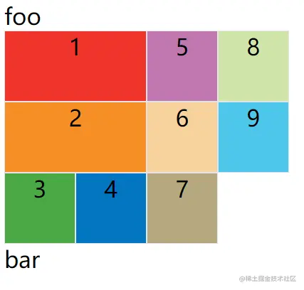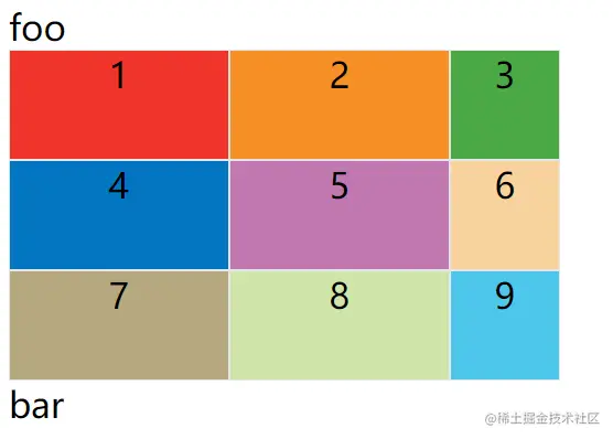 有时候,一些项目的指定位置,在现有网格的外部。比如网格只有3列,但是某一个项目指定在第5行。这时,浏览器会自动生成多余的网格,以便放置项目。 grid-auto-columns属性和grid-auto-rows属性用来设置,浏览器自动创建的多余网格的列宽和行高。它们的写法与grid-template-columns和grid-template-rows完全相同。如果不指定这两个属性,浏览器完全根据单元格内容的大小,决定新增网格的列宽和行高。 例子:划分好的网格是3行 x 3列,但是,8号项目指定在第4行,9号项目指定在第5行。