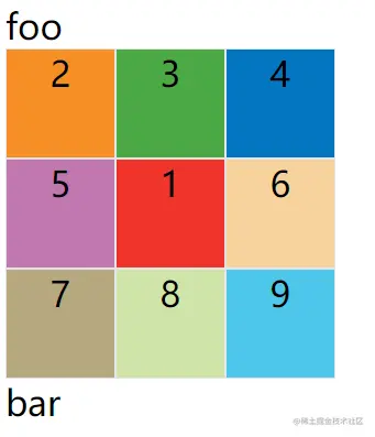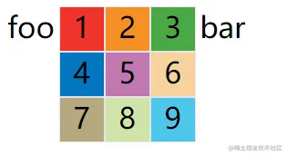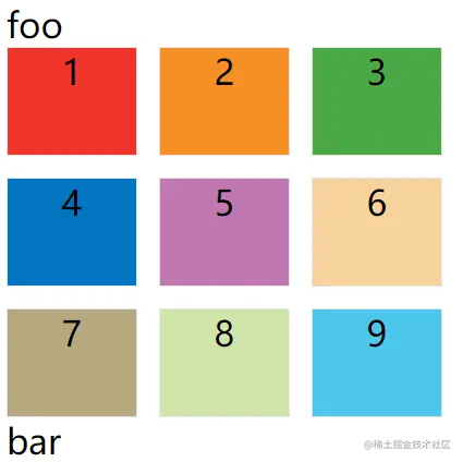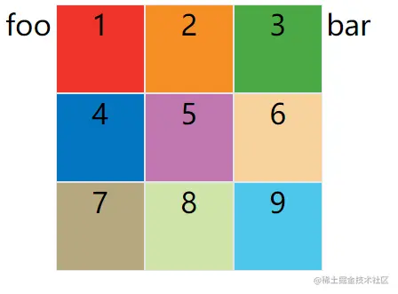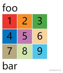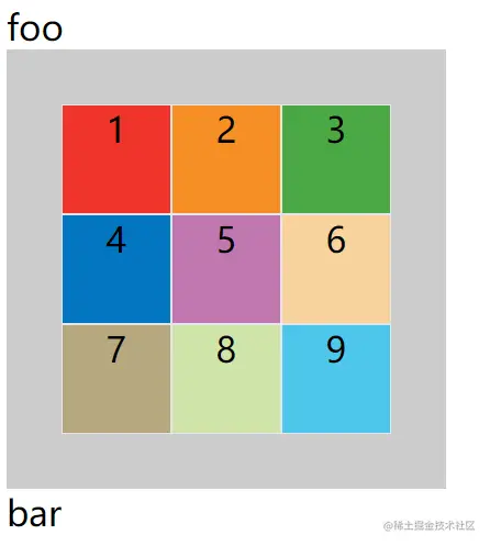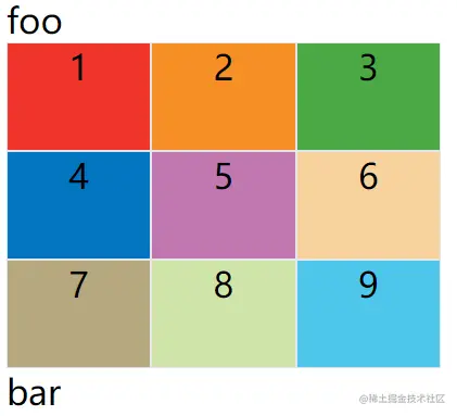 上面代码指定了一个三行三列的网格,列宽和行高都是100px。 效果图: