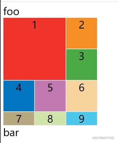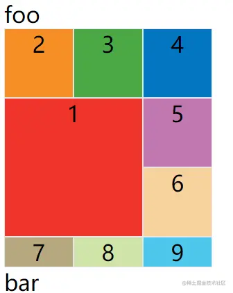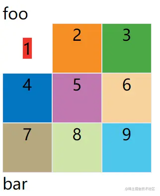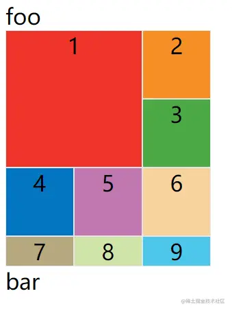 <div class="item" style="background: #ef342a;grid-area: 1 / 1 / 3 / 3;">1</div>
